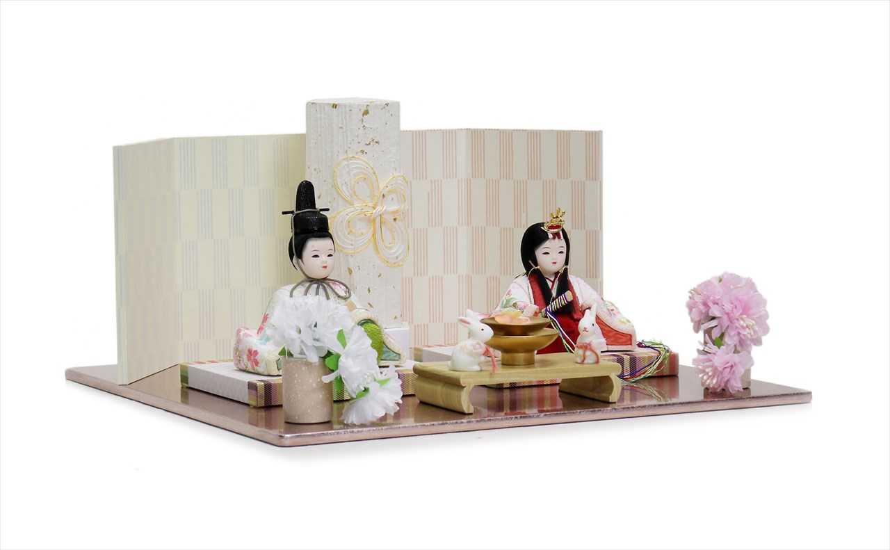 飾台 : 箔プレート スクエア ピンク 屏風 : 二曲 唐紙屏風 五筋市松(一対) 雪洞 : 16cm行灯 和紙六角スタンド 水引 花飾 : 御殿花 桃色陶器 桜衣ミニ 前飾 : 狛兎に桜水引重ね金杯 |