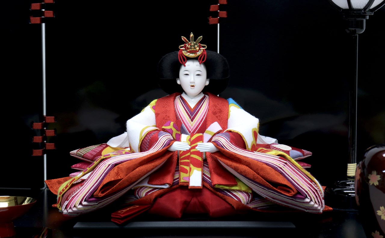 屏風 : 9号 木製黒塗 綺羅屏風 飾台 : 75x40 木製黒塗 凸凹 飾台 花飾 : 会津塗 変り桜橘 雪洞 : 木製 コードレス雪洞 白地柄 前飾 : 玉盃 兎彫金 漆塗 金朱 |